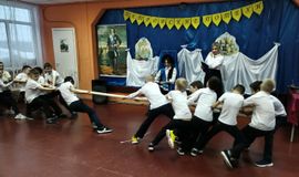 Ребята строили крепость, преодолевали болота, были всадниками, устраивали бой подушками, бегали в мешках и перетягивали канат. Также попробовали себя в изготовлении кораблей.