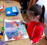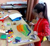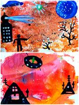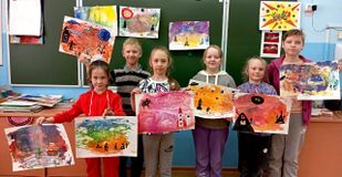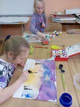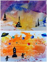 «Орлята» творческой группы выполняли рисунки космических пейзажей в технике монотипия.
