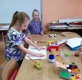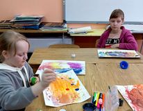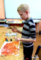 В нашей школе старшие ребята уже давно знакомы с этой техникой. Дети с удовольствием мазали поверхность парт краской и получали красивый отпечаток на бумаге. Мелкие детали дорабатывали в ручную. Было весело, каждый успел выполнить по две работы.