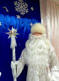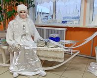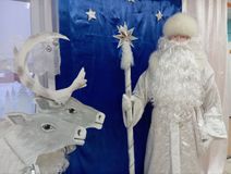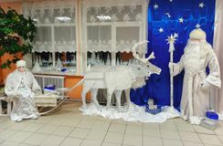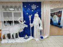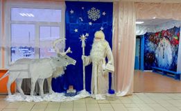 В фойе школьников встречал Дед мороз со своей благородной парой оленей и Снегурочкой на санях, которые спешат на праздник к ребятам.