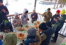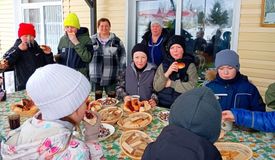 После окончания лыжной эстафеты участники и болельщики  отправились к школе, где их ждал приятный сюрприз. На площадке перед зданием работниками были расставлены столы, а повар встречала ребят и болельщиков  горячим чаем, сладостями и вкусными пышными булочками.