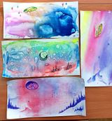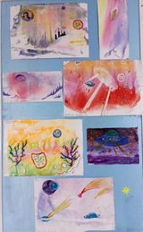 Дети с удовольствием мазали поверхность парт краской и получали красивый отпечаток на бумаге. Мелкие детали дорабатывали в ручную. В работах детей воплотились в реальность космические просторы, галактики, планеты и звезды, превратившись в отражение фантастической реальности в реальность нашего мира. Рисунки получились очень яркие, экспрессивные и по цвету и по форме. В работах нашли отражение далекие планеты, космические дали и немного сказки.