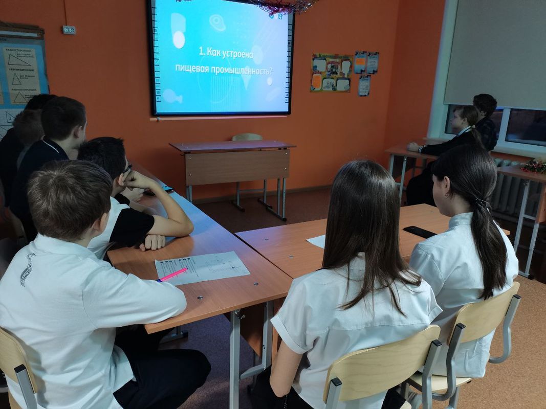 На внеурочных занятиях обучающиеся познакомились с пищевой промышленностью. Эта отрасль – одна из ключевых в экономике России и отвечает за продуктовую безопасность страны. Сегодня пищевая промышленность – это высокотехнологичная сфера, которая включает в себя различные подотрасли, такие как мясная, молочная, рыбная, хлебопекарная, масложировая, макаронная, кондитерская и многие другие. Учащиеся говорили и об общественном питании. Школьники увидели, как можно реализовать себя в этой области, познакомились с некоторыми актуальными профессиями и вариантами получения образования, а также посмотрели познавательные видеоролики, поработали с интеллект-картой профессий пищевой промышленности.